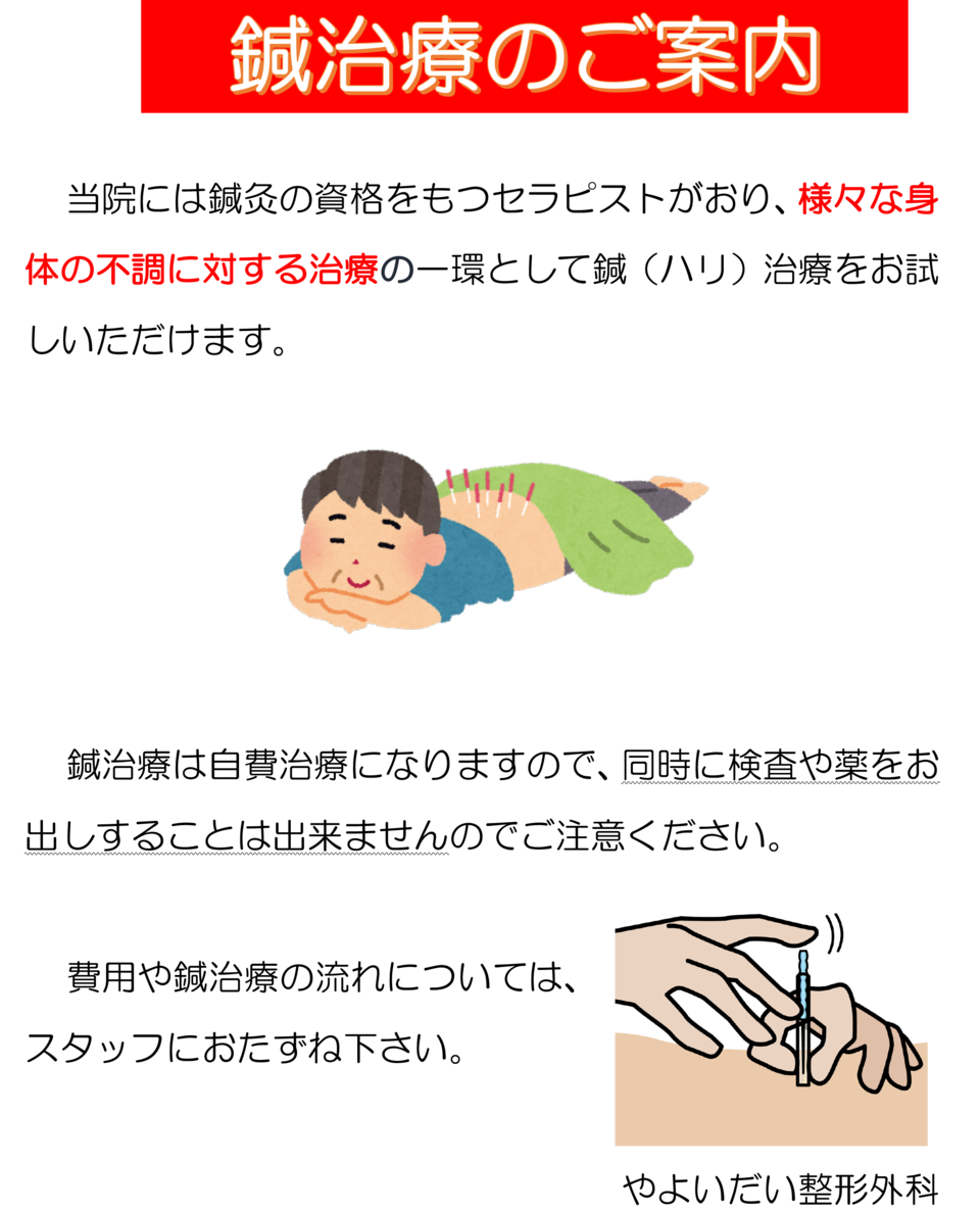 当院で実施しているマッサージ等の施術は、他の代替医療と違い医療保険の中で行っています。つまり、医師が責任を持って診察、治療を行いその必要性を判断して実施します。