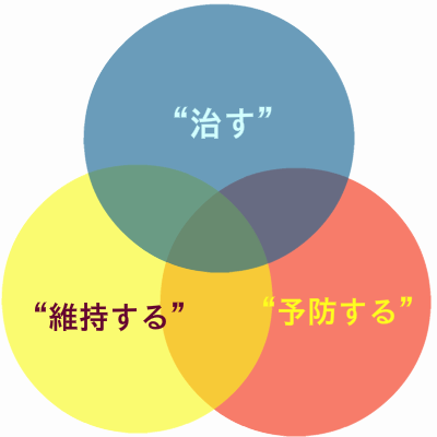 病気を治して元の状態に戻す『治す』治療、症状を緩和し、身体の状態を『維持する』治療、そして、再び身体の不調がでないよう に『予防する』治療です。