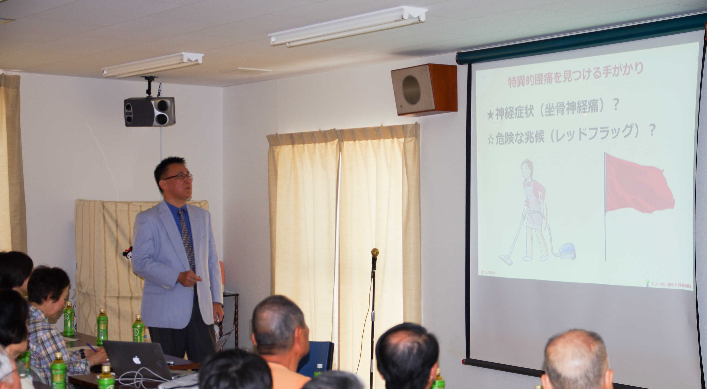 - 普段の診療で順序立ててお伝えできなかったことや最近の考え方・日頃気をつけていただきたい生活習慣などをまとめて紹介するために、医学講座として院内や近くの自治会館で行ってまいりました。院長の講演と理学療法士などの他のスタッフの実演などで1時間くらいでやっていました
