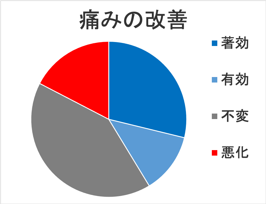 患者さんの感じる痛みを治療開始時と治療終了の時点で比較しました。痛みの程度が60%以上減った方の比率は全体の41.3%でした。