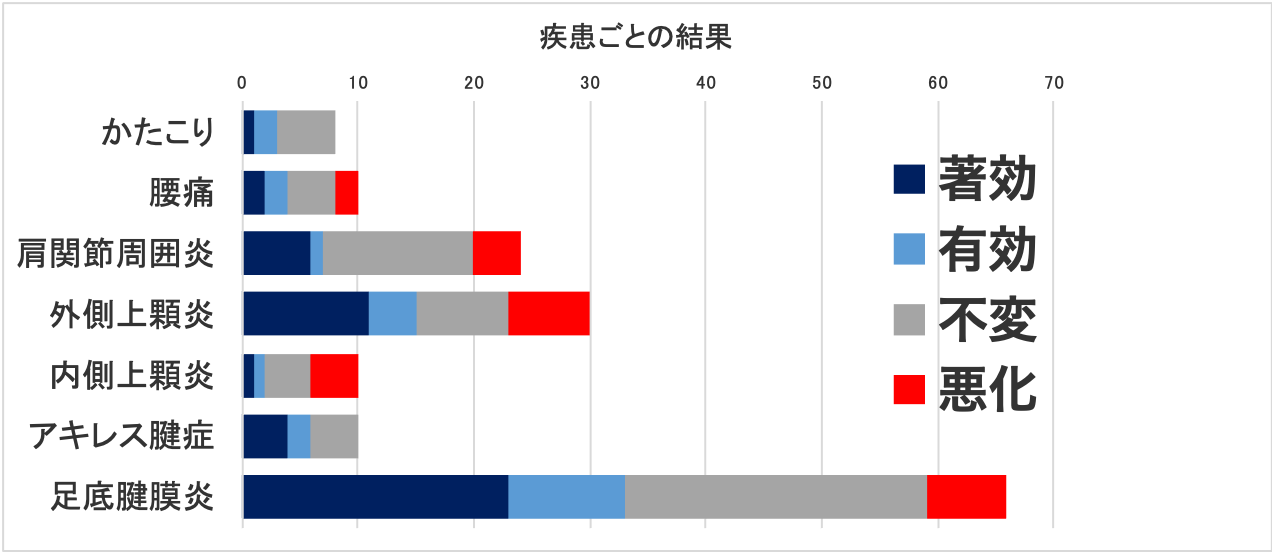 多くの方に施術した疾患のうち、外側上顆炎(テニス肘)や足底腱膜炎、アキレス腱症では痛みがよく取れる反面、肩こり、腰痛、肩関節周囲炎、内側上顆炎(ゴルフ肘)に対してはあまり効果は認められませんでした。