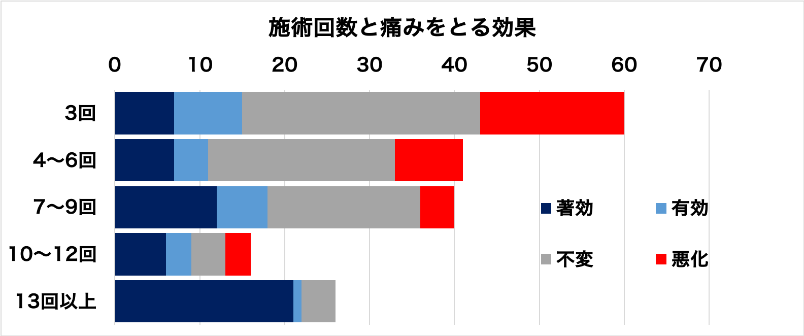 SWは何回やれば効果的なのかを明らかにするために、施術回数と効果の関連を調べました。