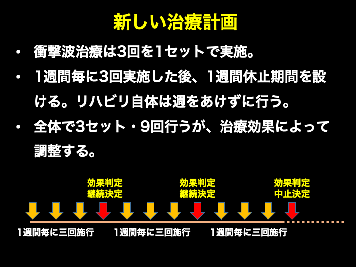 また、SW治療を何回行うかという点も明らかになり、それをふまえて、現在SWは以下のスケジュールで実施しています。